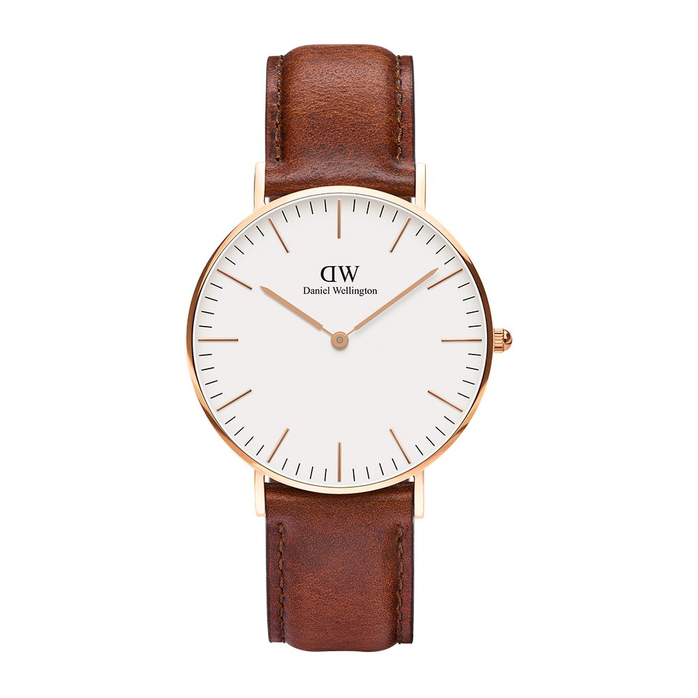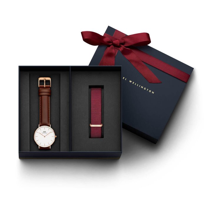 Classic St Mawes features a slim case, an eggshell-white dial and a brown leather strap made from genuine Italian leather. Paired here with the ruby red Roselyn NATO strap. Your purchase will be delivered in one of our specially designed boxes with gold debossed Daniel Wellington logo.